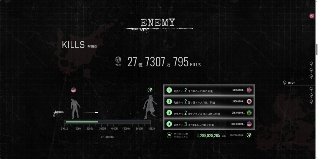 《生化危机:安魂曲》自推出后人气一路走高。官方RESIDENT EVIL.NET的全球统计数据页面显示,到3月6日为止,全球玩家在游戏中的总时长差不多达到了“一万年”,消灭的怪物总数更是超过27亿,这些亮眼的里程碑数据让整个行业都为之惊叹。