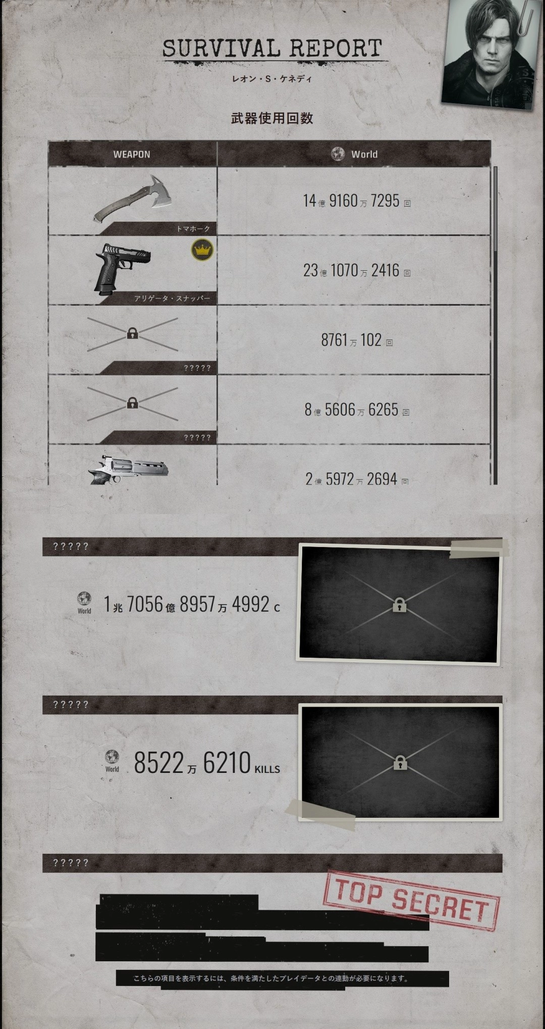 里昂·S·肯尼迪(Leon S. Kennedy)武器使用数据显示,短吻鳄钳(Alligator Snapper)以23亿1070万2416次使用量居首,短斧(Tomahawk)以14亿9160万7295次紧随其后。此外,多款未公开名称的武器使用次数亦达数亿至数十亿次。