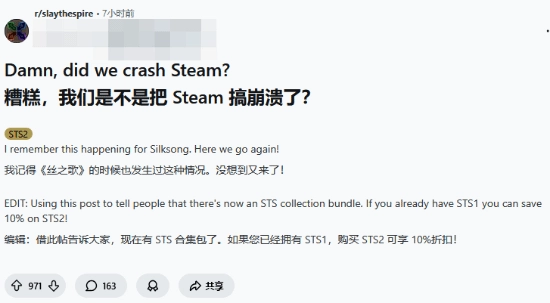 据Kotaku报道,尽管《空洞骑士:丝之歌》发售引发Steam崩溃的情景还历历在目,但Steam很快又迎来了另一款能让其服务器陷入瘫痪的游戏——《杀戮尖塔2》。