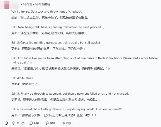 尽管游戏目前仍处于抢先体验阶段,其正式的完全体尚未发售,但依然受到了玩家们的热烈追捧。很快,就有玩家陆续反应在购买时遇到了商店页面卡顿、购买订单卡在处理中等问题。