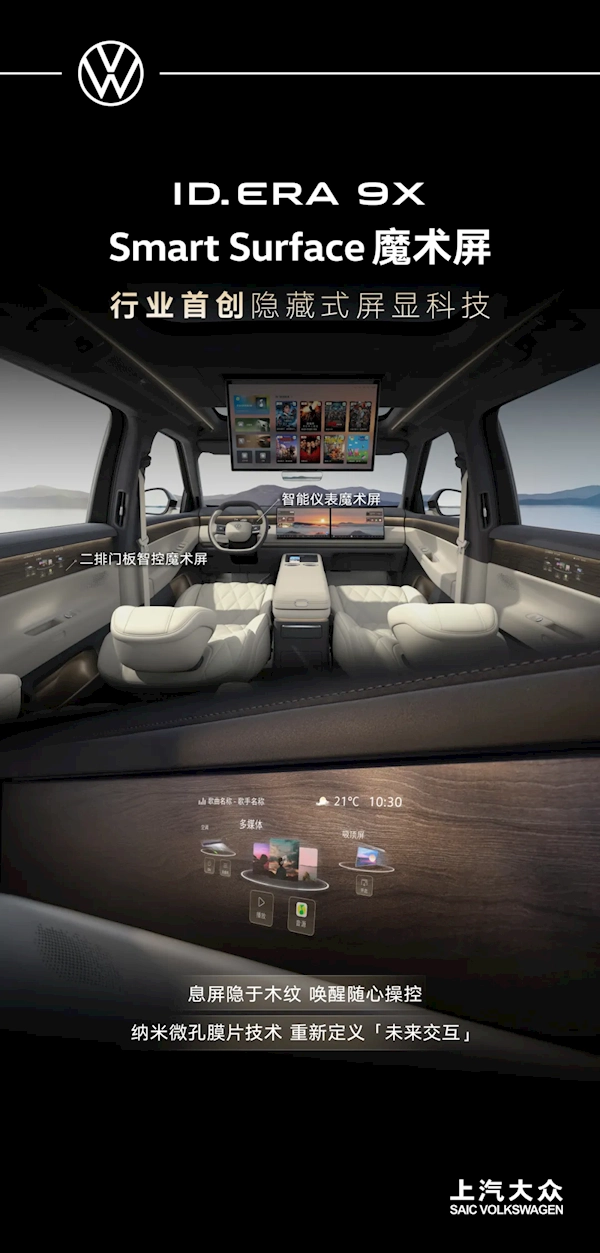 此外,该车首次搭载Smart Surface魔术屏技术,其采用微孔膜片工艺,在屏幕关闭时与内饰材质完美融合,实现“只见材质不见屏幕”的隐形式美感,点亮后画面清晰通透,无纹理干扰。