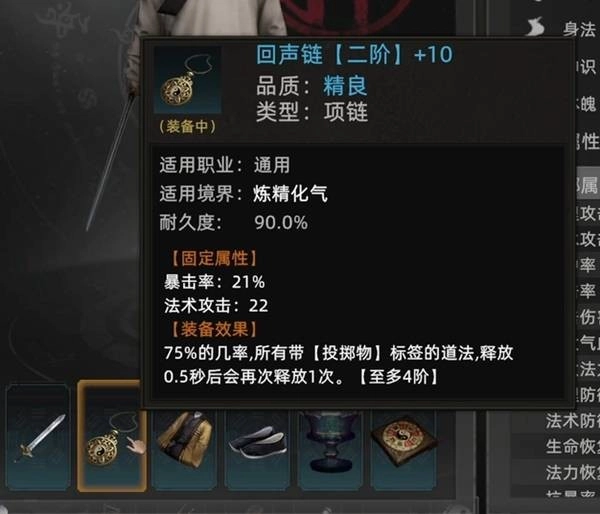 然后给角色配上回声链装备,它有75%的触发概率能让技能额外释放一次,这样就能一剑挥出10道剑气了。