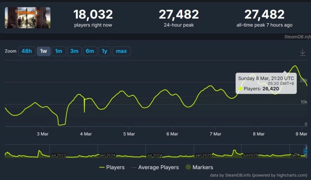 此前,《全境封锁2》在Steam平台的日均在线玩家数量仅为3500人。而在路线图公布之后,同时在线玩家数攀升至27482人,创下了该作在Steam平台的历史最高纪录。游戏玩家基数的增长幅度超过了700%。截至目前,仍有18032位玩家活跃在《全境封锁2》的游戏世界中,一边积极搜刮物资,一边等待后续更新的到来。