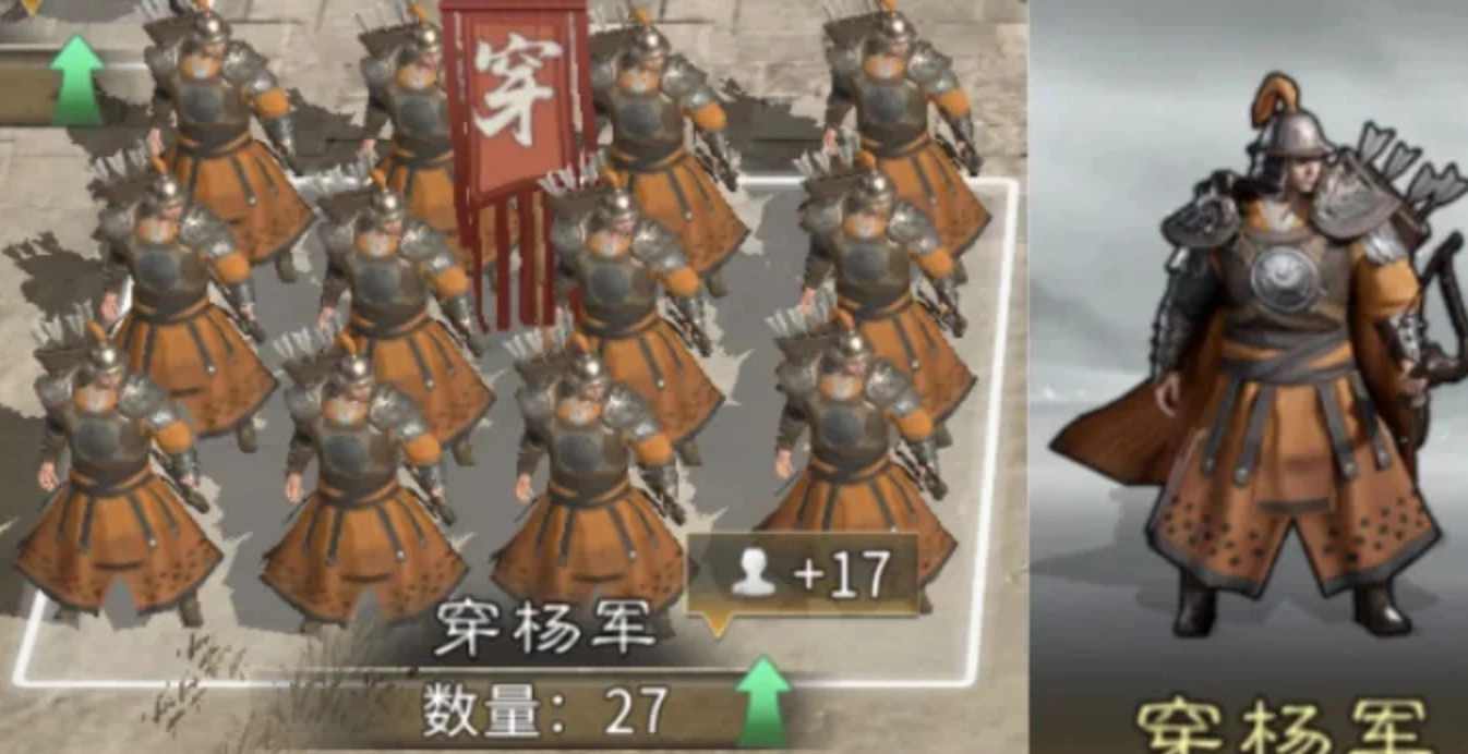 兵种选择上,一名穿杨军放在三名武将追击格上做主输出,一名藤甲兵放在典韦下边做伤害,另一名藤甲兵单独放在第三行中间分担敌方第三行输出,防范孙策、西凉铁骑等整排伤害单位。根据合理的兵种站位,可以充分发挥典韦的挑衅作用以及小乔的套盾技能,使穿杨军在输出的过程中不容易被迅速击杀,进而保持整个战局的稳定。