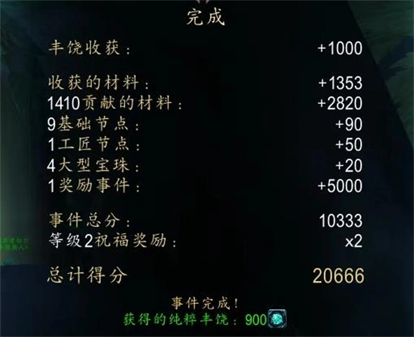 4、全能之神的成就需要你在丰饶事件的每一项得分里都有点数,打完丰饶会有一个事件结算的清单,可以查看具体的点数,推荐一个人单刷,这样可以获得更多分数。