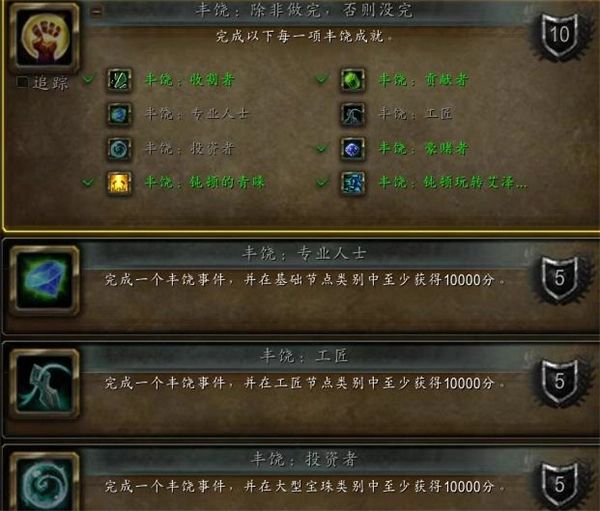 5、丰饶收获:必须打丰饶收获事件,每8H轮换一张地图,可以点任务列表后在右边点“游戏活动”查看轮换时间表。基础节点:永歌森林有3种形态,箱子、罐子、坟堆,点任意一种即可,祖阿曼是剥皮,哈赖是草药,虚影是矿。工匠节点:就是上一个成就的专业节点,所以需要丰饶收获的地图搭配你的专业技能才能做这个成就。例如我只练了附魔25点,我就只能在永歌森林丰饶收获的时候才能做。然后我又练了烹饪25点,我就也可以在祖阿曼丰饶收获的时候做。