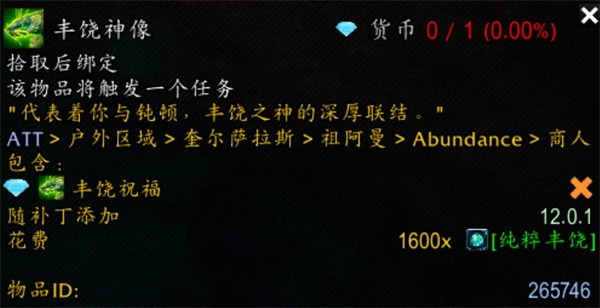 7、丰饶神像,需要1600个纯粹丰饶货币,这个是“祝福祭坛:忏悔的巨魔”成就中的“钝顿,丰饶之神”,只能一个号购买,第二个号买了也不能再接任务了。