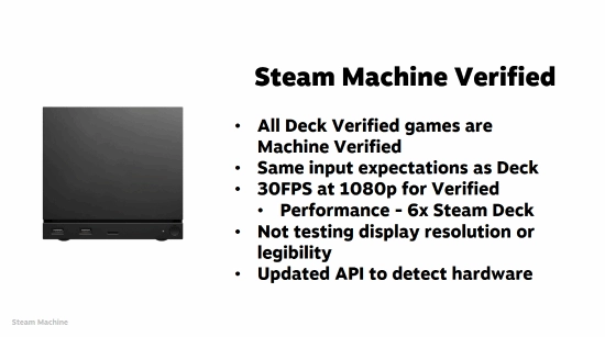 首先是Steam Machine。Valve指出,有一个十分简单的条件:要是游戏已经通过Steam Deck的认证,那它就自然满足Steam Machine的认证要求。不过,还有一些额外的补充条件:因为Steam Machine内部的硬件性能是Steam Deck的好几倍,所以性能认证的目标是至少要在1080p分辨率下达到30帧。