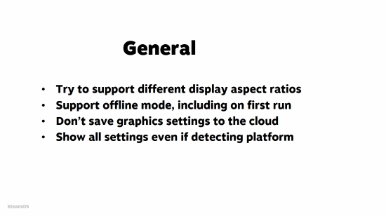 在演讲的其余部分,Valve还强调了开发者在为SteamOS制作游戏时应关注的一些关键点。其中一个特别值得注意的建议是:游戏应该支持离线模式,包括首次启动时也能离线运行。