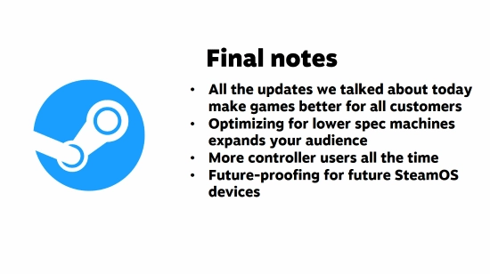 此外,Valve还强调:优化低配置设备可以扩大玩家群体(这一点值得到处大声宣传);使用手柄的玩家正在不断增加;开发者应该为未来的SteamOS设备做好前瞻性适配。