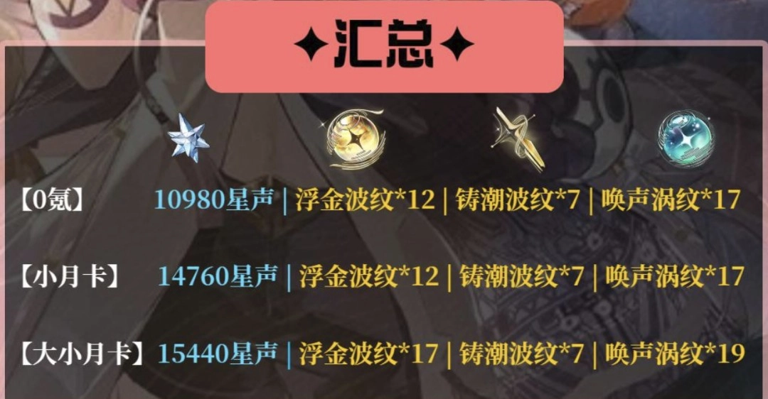 总的来说,3.2版本依旧按平民零氪、小月卡、大小月卡玩家来划分福利。其中零氪玩家可获得10980星声,外加浮金波纹*12、铸潮波纹*7、唤声涡纹*17;小月卡玩家能拿到14760星声,金球武器和蓝球数量与零氪一致;大小月卡玩家则有15440星声,金球比零氪多5个,蓝球多2个。作为过渡版本,这样的星声福利已经相当不错了。