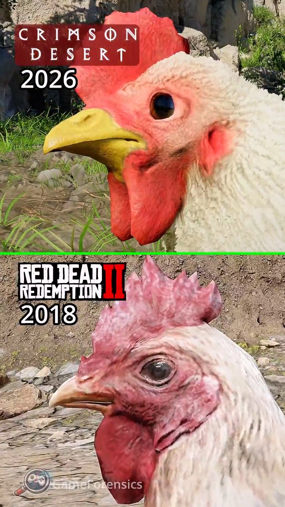 第一个是从小鸡这种动物模拟的角度对比。众所周知,R星的《荒野大镖客2》物理模拟做的非常好,处处表现着各种小细节。此前的《生化危机9》已经在布料机制上被吊打,而这次轮到《红色沙漠》的小鸡了……