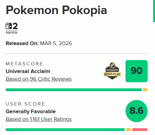 《宝可梦Pokopia》: 紧随其后,均分已经升至90分。作为系列口碑的新巅峰,它成功夺得了M站的“Must-Play(必玩)”金色勋章。