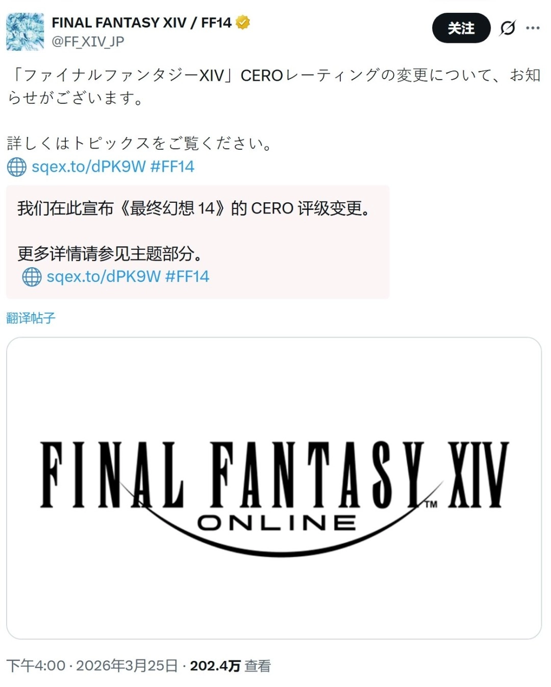 据日本游戏杂志《Fami通》消息,《最终幻想14》的日本CERO评级已由“C”级(适合15岁及以上)调整为“D”级(适合17岁及以上)。这一评级变动让许多玩家颇感意外,毕竟这款游戏自2013年以现有形态运营至今,已历经十余年时间。