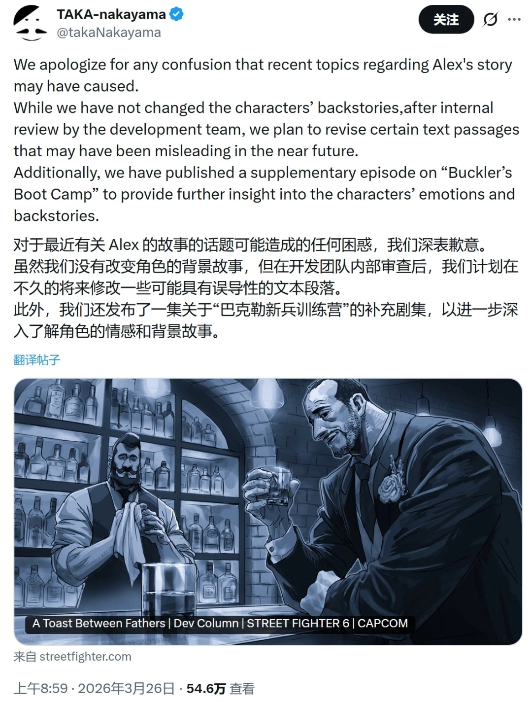 《街头霸王6》在上周推出了经典角色阿莱克斯的DLC,这位从《街霸3》时期就登场的战士原本应该备受期待,却因为新增的背景故事引发了轩然大波。争议的程度如此之大,以至于游戏总监中山贵之不得不亲自出面致歉,并承诺会对相关文本进行修订。