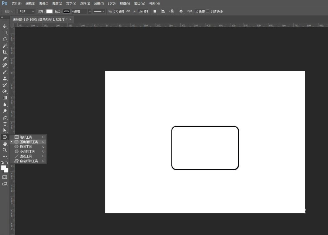 2、从工具栏找到“圆角矩形工具”,或者使用快捷键U,绘制一个圆角矩形,填充白色,加上黑色描边。