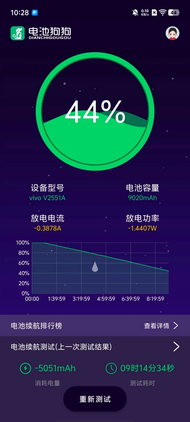 对于中端用户而言,长续航往往是比性能更刚性的需求。iQOO Z11这次配备了一块与宁德新能源联合研发的单电芯超薄蓝海电池,容量达到9020mAh,在目前的手机市场中属于天花板级别。实测数据显示,在电池狗狗连续续航测试中,运行9小时15分钟后电量仍剩余44%,这样的表现足以应对全天重度使用。
