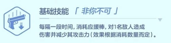 她的被动技能“长时间演出”能够直接提升自身的体力上限。对于前排角色而言,更高的生命值意味着更强的生存能力,这个技能提供了非常扎实的耐久保障。基础技能“非你不可”会周期性触发,消耗应援棒对一名敌人造成伤害并降低其攻击力。该技能的效果强度与消耗的应援棒数量直接相关,棒数越多,减攻效果越显著。