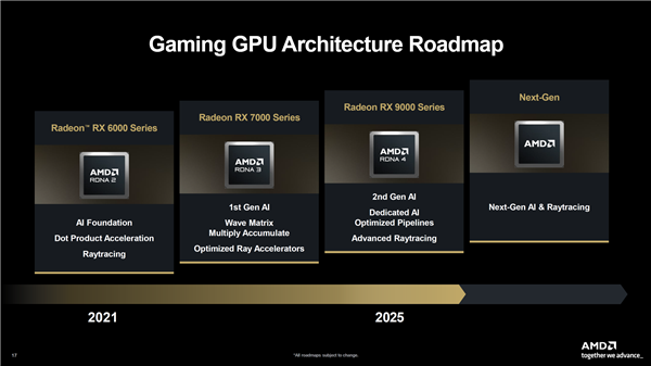在显卡领域,AMD仅表明下一代游戏产品会支持下一代AI以及下一代光线追踪技术,然而并未披露任何有关架构的细节、具体的名称或是时间表路线图。