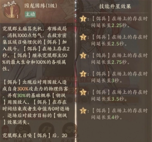 核心效果:在敌方密集区域召唤饵兵,饵兵继承郡主50%最大生命、100%全属性,存在期间对周围造成300%攻击力物理伤害,并有基础30%概率嘲讽敌人,饵兵退场后嘲讽效果消失。