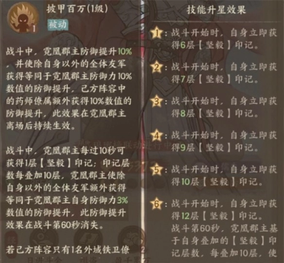 技能升星优先拉满披甲百万至6星,该技能是郡主后期改变战场节奏的核心,6星初始12层坚毅印记可让团队前期就获得高额防御加成。