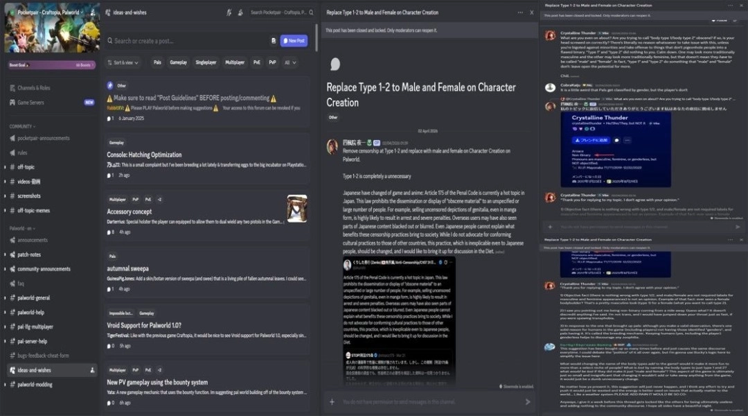 近日,热门模拟经营游戏《幻兽帕鲁》又一次引发了玩家的不满。在reddit平台上,一位日本玩家依据日本审查相关法规,建议开发商将游戏捏人系统中“体型1”“体型2”的设定调整为常规的男女性别选项。起初这只是个不太起眼的提议,然而该帖子发布仅一天就被开发商锁定,这一操作随即遭到了玩家们的强烈批评。
