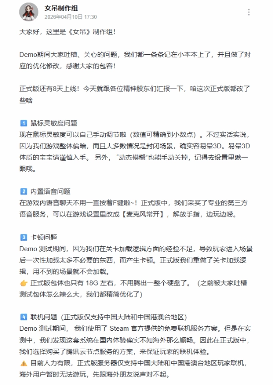 近期《女吊》官方也公布了正式版的优化内容。正式版迭代了整套联机方案以及关卡加载逻辑。Demo被玩家吐槽的联机和卡顿问题,基本得到解决。不过因为制作组人手和资金有限,目前只部署了国内(包含港澳台地区)的服务器,海外玩家暂时无法游玩。
