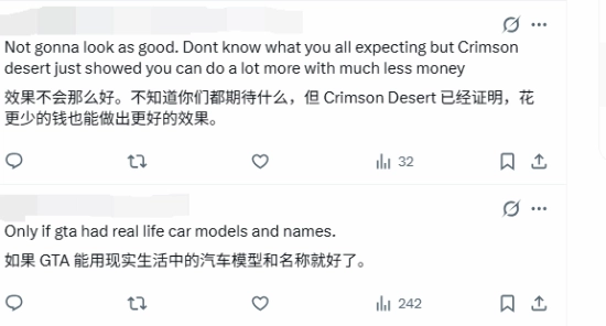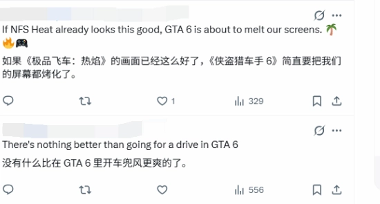 也有玩家表示画质高不一定代表画面观感好,《极品飞车》系列一直以超高画面观感著称,如《极品飞车19》的次时代效果光影和《极品飞车:不羁》的漫画特效,在风驰电掣之中,《GTA6》的速度感和氛围感也许真的不如这款7年前的作品。