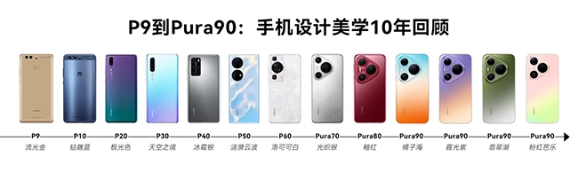 橘子海的诞生并非偶然。回顾华为P系列与Pura系列的发展轨迹,每一代产品都在行业同质化的环境中探索出独特的设计方向。2018年,P20系列的极光色惊艳亮相,通过纳米真空光学镀膜技术呈现蓝紫渐变效果,首次将结构色应用于手机机身,打破了当时手机颜色非黑即白的单调格局。2019年,P30系列的天空之境进一步深化渐变美学,以精密镀膜技术还原盐湖在不同时段光影下的细腻变化。随后,P40系列以四眼车灯般的秩序感重新定义了镜头模组的设计标准,P50系列则通过万象双环将几何美学融入影像功能。P60系列的洛可可白采用创新的凝光贝母工艺,使每一部手机都拥有独特的自然纹理;Pura 70系列则推出风向标三角模组,建立了全新的几何设计秩序。每一次更新都是对设计边界的拓展。华为Pura 90系列在这一设计脉络上继续突破,从引领色彩趋势升级为引领情绪美学,实现了从技术优势到情感共鸣的跨越,再次巩固了其在科技美学领域的引领地位。