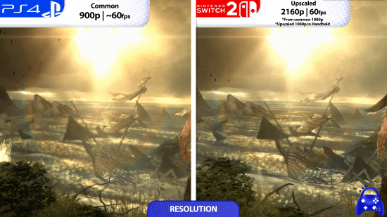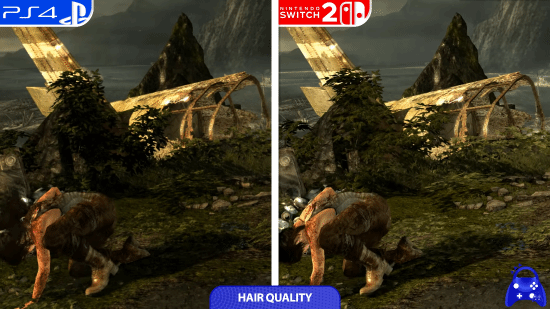 Switch2版在头发质感、阴影效果、植被渲染以及全局光照系统上,有着最为显著的降级情况。和PS4版相比,Switch2版额外增加了一些树木植被。在运行表现上,Switch2版可以1080P分辨率稳定输出60帧,然而原本的PS4版只有900P分辨率,并且偶尔还会出现掉帧现象。