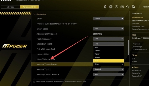 往下翻找到内存设置区域中的High-Efficiency Mode设置,打开后即可找到Memory Timing Preset功能,这项就是微星主板的一键D5优化设置。