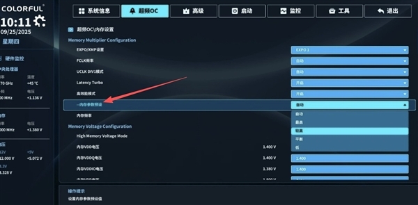 不难发现,七彩虹主板同样为大家提供了4种预设档位用于调节,和上述其他品牌的主板一样,大家依据自身内存的体质进行调整就行。