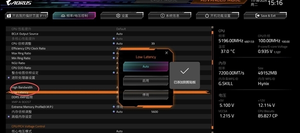 下面的High Bandwidth和Low Latency这两项功能就是,开启即可一键激活D5黑科技。技嘉BIOS默认D5黑科技为Auto,Auto会关闭D5黑科技,所以需要手动开启设置。