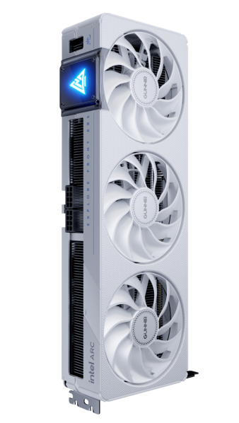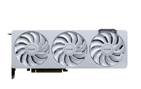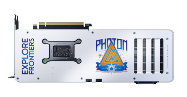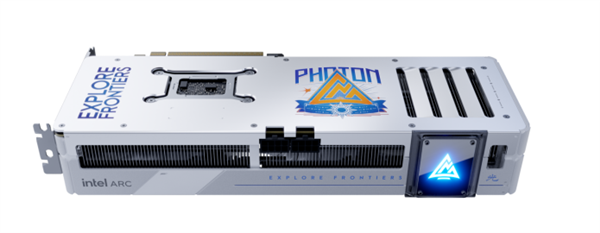 显卡定价2000元左右,官方配色只有黑和白两种配色,正面仅用波点装饰,标准的三风扇模型,方正的版型,低调酷炫之余又干净简约。视角调整到显卡的背面,有一块一体化的金属背板,装饰着探索主题的图案与Photon系列徽章,背板中部采用镂空设计帮助显卡提高整体散热效率。侧面印有Intel的logo和隶书字体雕刻的“光”字,中西结合的设计让显卡本身更有辨识度。侧面搭配了一个独特的挡板,用点阵式的方法装饰了UNNIR的logo,为显卡本身增加一些未来科技的味道。