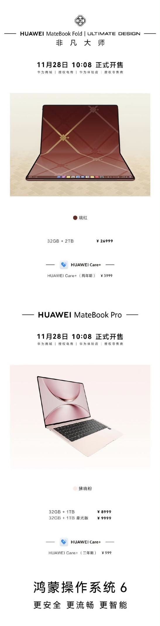 值得一提的是,选购华为鸿蒙电脑时,您还能搭配贴心服务,为设备提供全方位保障。若随新机加购HUAWEI Care+服务,华为MateBook Fold 非凡大师可享受2年1次的屏幕保障服务,两年期优惠价为3999元;华为MateBook Pro则可享有2次意外保障、3年官方质保,且当电池最大容量低于80%时可免费更换电池,三年期仅需999元,一步到位,贴心呵护您的设备!