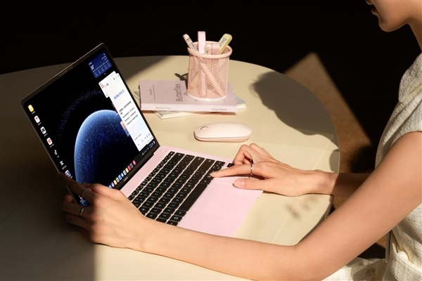 华为MateBook Pro 拂晓粉的灵感则源于清晨霞光,那种柔和不张扬的色调,恰好适配职场与生活多场景。机身采用镁合金微绒金属工艺,打破了传统金属机身的冰凉感,指尖触碰时能感受到细腻温润的质感,而且经过特殊处理后,不仅耐磨抗刮,日常使用中也不容易留下指纹。首次在产品两侧的腰线上采用独特的“飞跃线”设计,轻薄中尽显时尚与温柔。