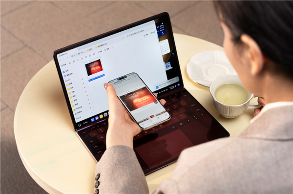 跨设备互联的体验也进一步升级,工作中需要用到手机里的照片或文档时,不用再通过微信传输或数据线连接,电脑可以直接调用手机相机拍照,或者从手机图库中选取素材,哪怕手机处于灭屏状态也能操作。需要双屏办公时,把平板无线投屏到电脑上,主屏写文档、副屏放参考资料,不用频繁切换窗口,办公效率自然大幅提升。还支持碰一碰互联传输功能,只需使用HarmonyOS 6系统的手机顶边轻触电脑屏幕即可一步完成跨设备内容分享,让电脑与手机、平板无缝互联。