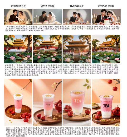 全面的客观基准测试充分验证了 LongCat-Image 的核心竞争力:在图像编辑任务中,ImgEdit-Bench(4.50 分)、 GEdit-Bench 中英文得分(7.60/7.64 分)均达到开源 SOTA 水平,且逼近头部闭源模型水平;在文字渲染方面,ChineseWord 评测以 90.7 分的成绩大幅领先所有参评模型,实现常用字、生僻字的全量精准覆盖;文生图任务上,GenEval 0.87 分、DPG-Bench 86.8 分的表现,使其在生图基础能力上相比头部开源与闭源模型依然具备强竞争力。