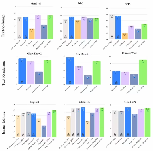 在文生图方面采用大规模的人工主观评分(MOS)方法,核心覆盖文本-图像对齐、视觉合理度、视觉真实度、美学质量 4 个维度,LongCat-Image 的真实度相比主流开闭源模型表现出色,同时在文本-图像对齐与合理度上达到开源 SOTA 水平。在图像编辑方面采用严格的并列对比评估(Side-by-Side, SBS)方法,聚焦于综合编辑质量、视觉一致性这两个用户体验的维度,评测结果表明,LongCat-Image 虽然与 Nano Banana、Seedream 4.0 等商业模型存在一定差距,但显著超越了其他开源方案。