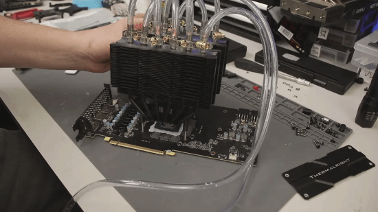 硬件改装玩家TrashBench又推出了新的改造项目:把常见的CPU风冷散热器改造为显卡一体式水冷散热器,以此来挑战极限超频。
