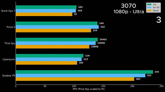 首次测试对象是MSI RTX 3070,安装改造后的散热器并启动冰水循环后,3070的核心温度达到了-14°C,在核心频率超频320MHz后,其性能获得了约10%的平均提升。
