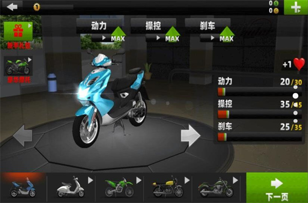 3、通过比赛赚取金币,可以购买或升级摩托车,相当的兴奋。