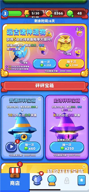 游戏中装备分为优秀、稀有和史诗装备,优秀大家都叫他史诗装备,是前期玩家的主要装备,可以通过砰砰宝箱抽取获得,也可以在关卡中获得。稀有和史诗装备是属性较好的装备,可以通过砰砰宝箱抽取和合成获得,史诗宝箱的掉落概率很低,所有对于平民玩家来说一套稀有装就很不错了。