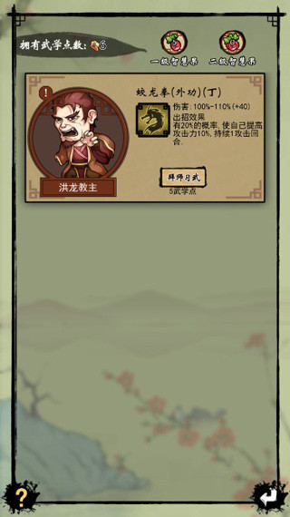 2、武功修炼可以提升基础威力和出招效果触发概率;(修炼等级上限50级)