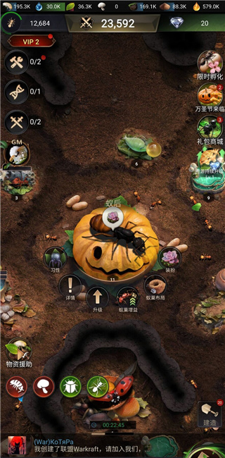 蚁巢上百种建筑资源囊括蚂蚁日常生态的各种环节,你可建设各类资源采集地,为蚁巢发展提供巨大容量的存储仓库;建造旅行虫栖息地,与外来的瓢虫交易巢内多余资源;还能建设工蚁栖息地,为忙碌的生产提供更多的后备蚁...凡此种种,蚁巢内的建筑布置,皆由你一手掌控。从小小蚁镇,到繁荣蚁国。