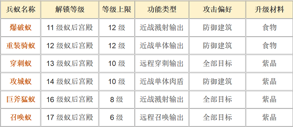 3.后期:推荐优先升级攻城蚁和穿刺蚁,穿刺蚁投射长矛,同时打击一排敌方目标,火力输出十足; 攻城蚁摧毁城墙和敌方防御建筑,且血厚移速快,可以用来开路和分散敌方站位。