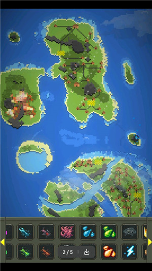 5、毁灭玩法:对于毁灭方面的玩法,它也是有着较多的可玩性。正常世界中的导弹、核弹、沙皇炸弹...一一不少的搬进了其中,威力较大,可对陆地上的文明及地形进行毁灭性的打击。另外,虚构的武器也加入了进来,例如:从天而降的保龄球、抛下即消灭一半生物的硬币、贯穿天地的炽热射线,这些都对游戏提高了趣味性。