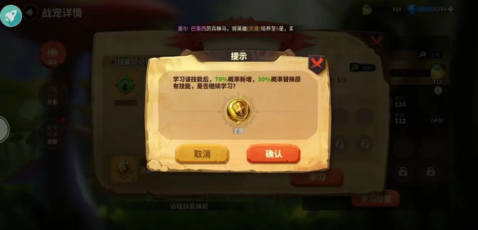 2、学习技能 第一次学习几率100%,第二次70%且有30%几率替换原有技能。学习了的技能和战法不同,无法卸除
