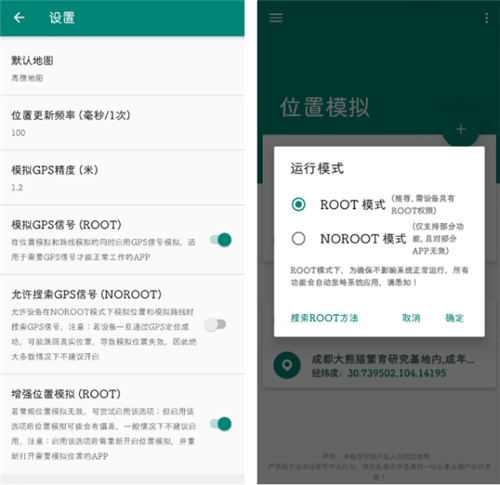 大部分软件使用非root模式就可以成功,而如果软件位置真的没有模拟成功则说明该软件检测算法较为高明,需要开启root模式后在软件内运行模式选择Root模式,下方设置内打开gps信号模拟和增强位置模拟功能,实测这个方法基本可以通杀所有软件的位置检测,当然这个增强功能只有解锁了专业版才可以使用,也可以使用石皮解版白嫖。
