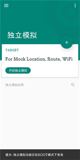 独立模拟:对指定应用单独模拟定位、路线和WIFi环境,可理解为是软件的作用域,该功能需Root权限。